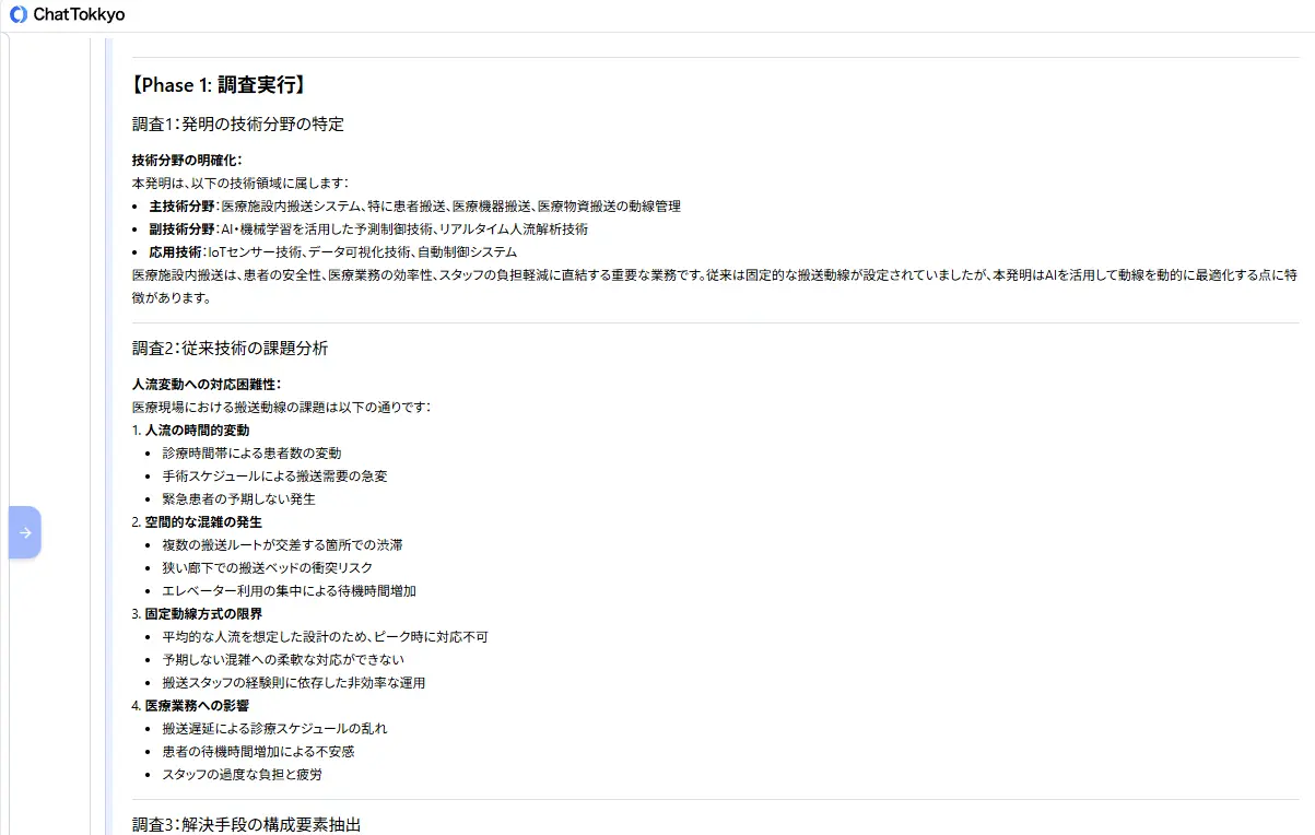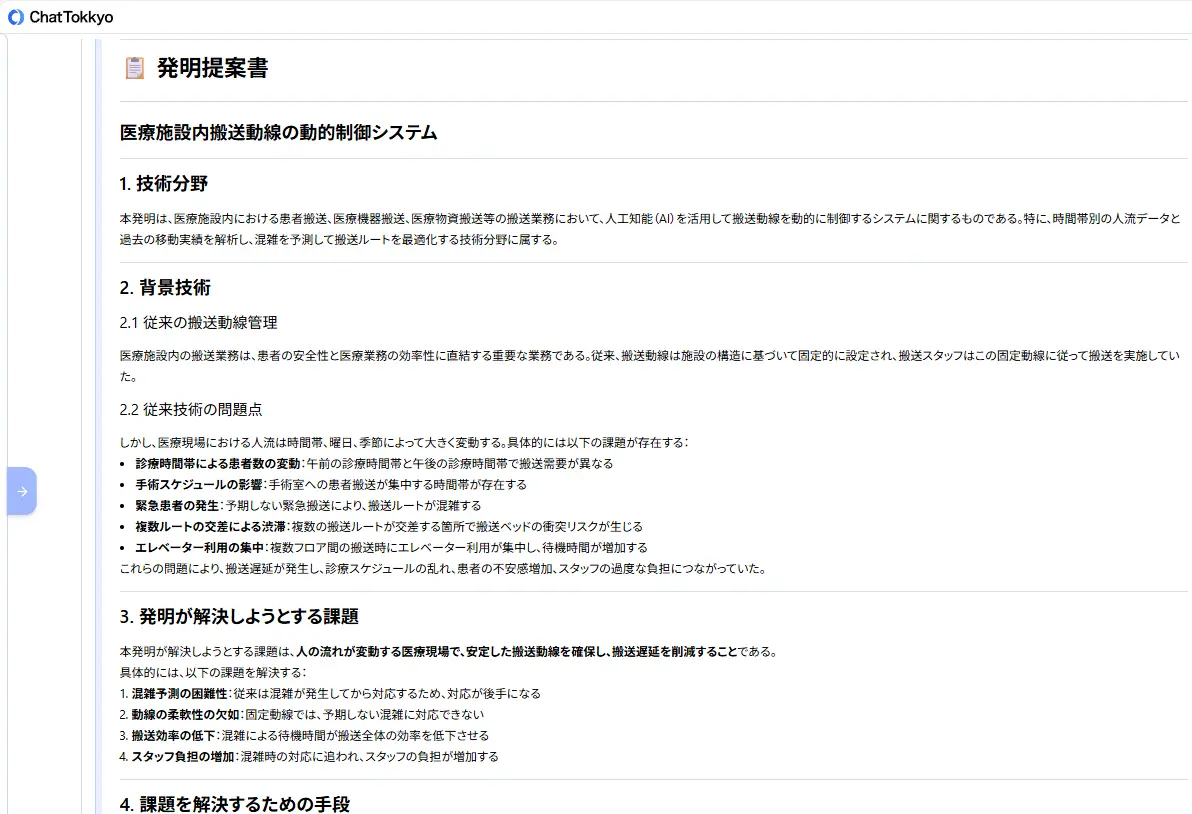 さらに、医療施設向けロボットや動線制御に関する膨大な先行技術を参照しながら検討を進めることで、人間が手作業で行うには限界があった高度な知財調査も同時にカバーできる。その結果、「課題」「解決手段」「技術的効果」といった特許申請に必要な構成要素を整理し、発明提案書として可視化することに成功したのである。