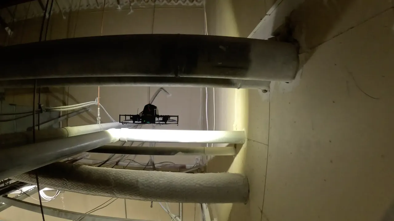 最大の特徴は、独自開発の高度自律制御プログラムだ。下水道やプラント内部などの非GPS環境では、従来のドローンは不安定になりやすく、壁面への衝突リスクが常に付きまとっていた。一方、本機に搭載された制御プログラムは、GPSを利用できない屋内や配管内部といった過酷な環境においても揺るぎない安定飛行を可能にする。