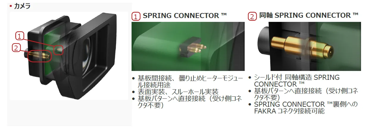 例えば、車載カメラでは高精細映像のリアルタイム処理のため、高速かつ安定した信号伝送が不可欠です。スプリングコネクタの技術は、振動や温度変化に強く、長期信頼性を確保できるため、自動運転や安全支援システムの進化を支えます。
