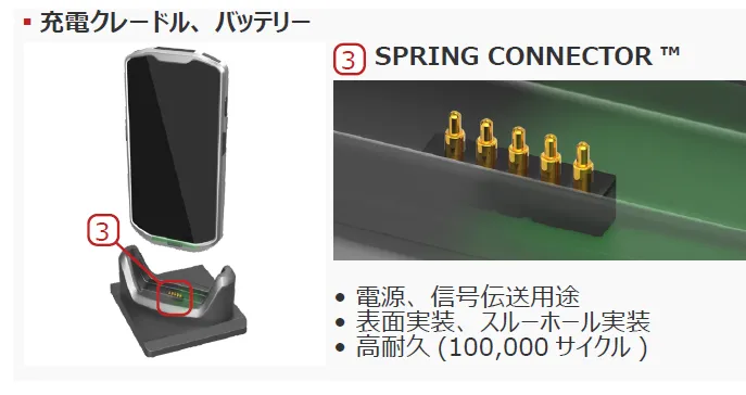 充電周りはもちろん、データ送信においても効果を発揮。高い周囲波数にも対応し、低インピーダンス(流れにくさ)にも対応。5G対応機器ではスプリングコネクタの技術が通信品質の向上に貢献しています。
