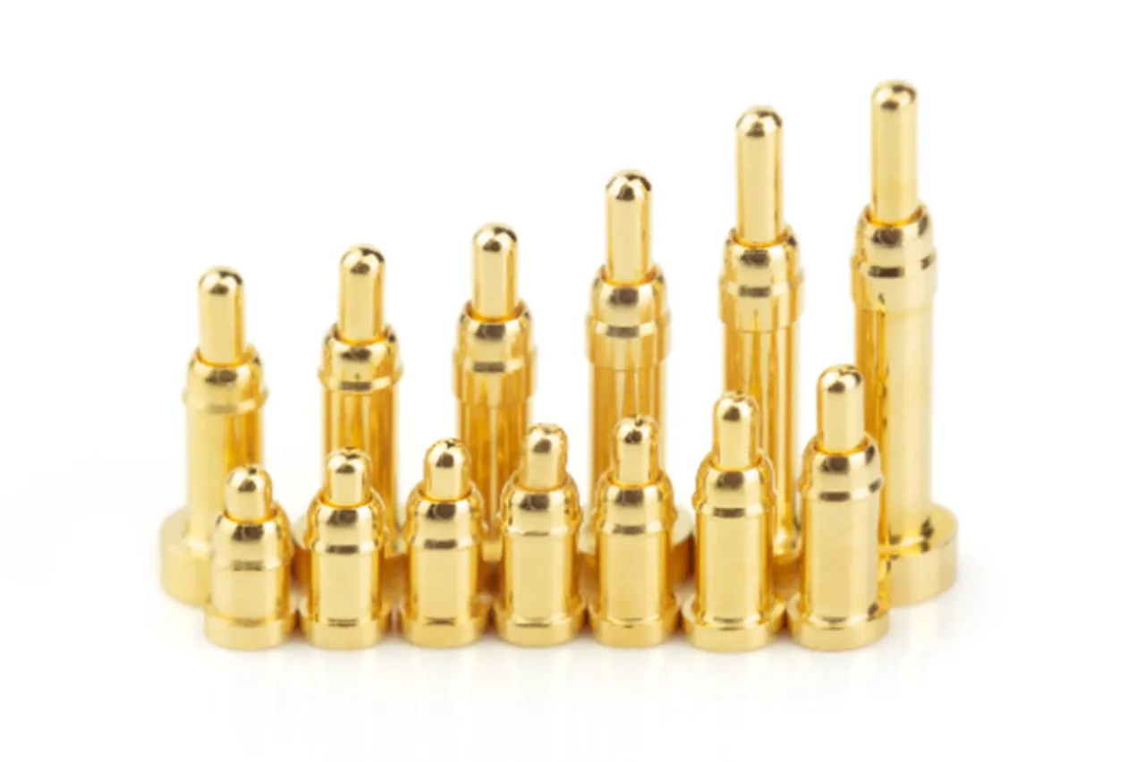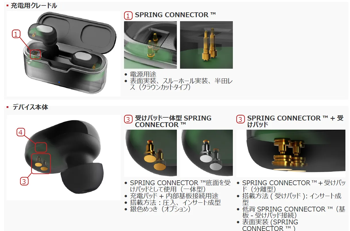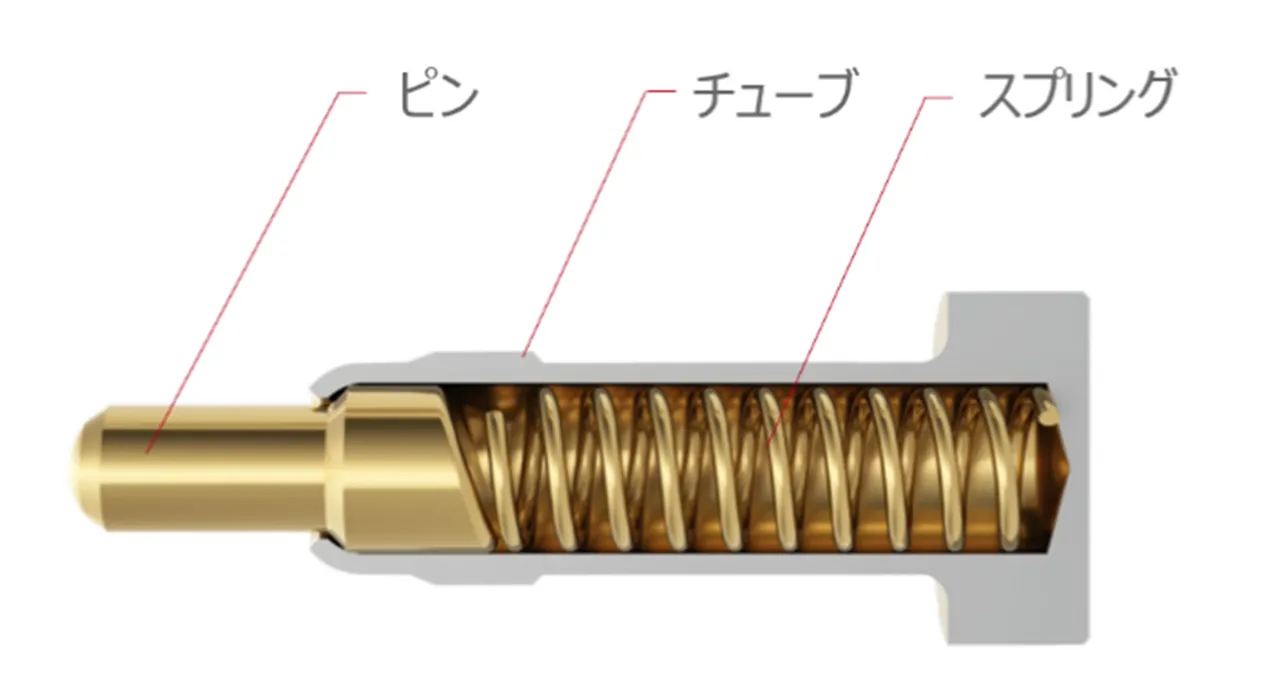 スプリングコネクタとは、極小サイズのチューブ内にコイルスプリングを内蔵した小型電子部品です。(※一般にポゴピンコネクタとも呼ばれます)構造はピン・チューブ・スプリングの3点で構成され、スプリングの力で対向する接点に押し付け、相手側にしっかりと電気的接続を実現します。バネの作用によって振動に強く、着脱が容易であること、そして省スペースでの実装が可能なことが特徴です。皆さんが使っているワイヤレスイヤホンのケースや、タブレットデバイスの充電スタンドで見た事があるかもしれません。