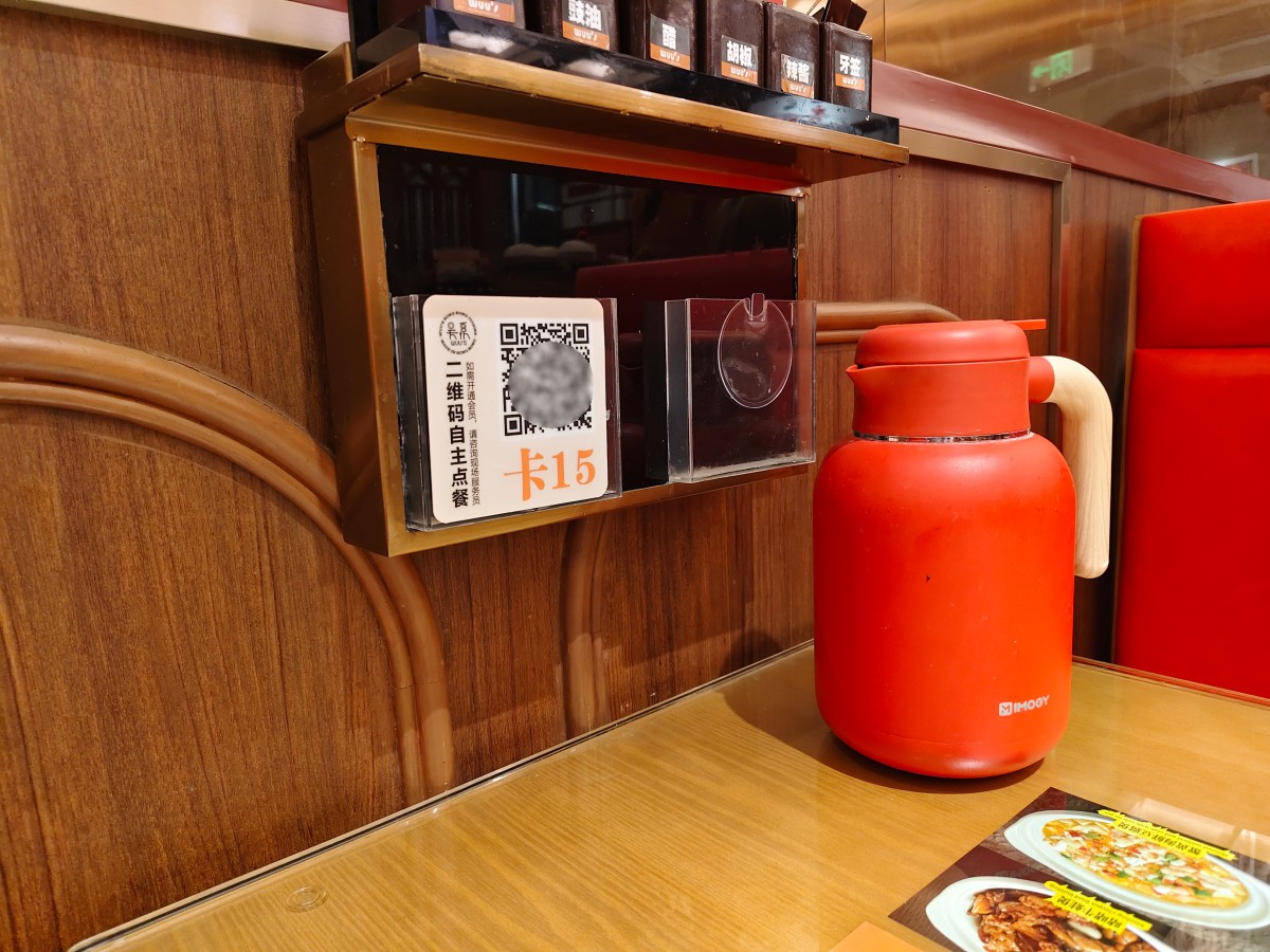 中国の飲食店でよく見られるテーブル上の注文、決済用QRコード(ぼかし処理済み)