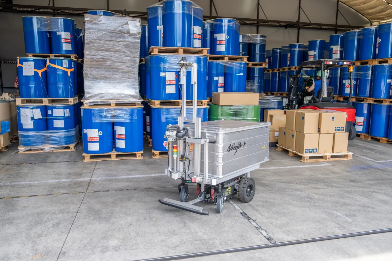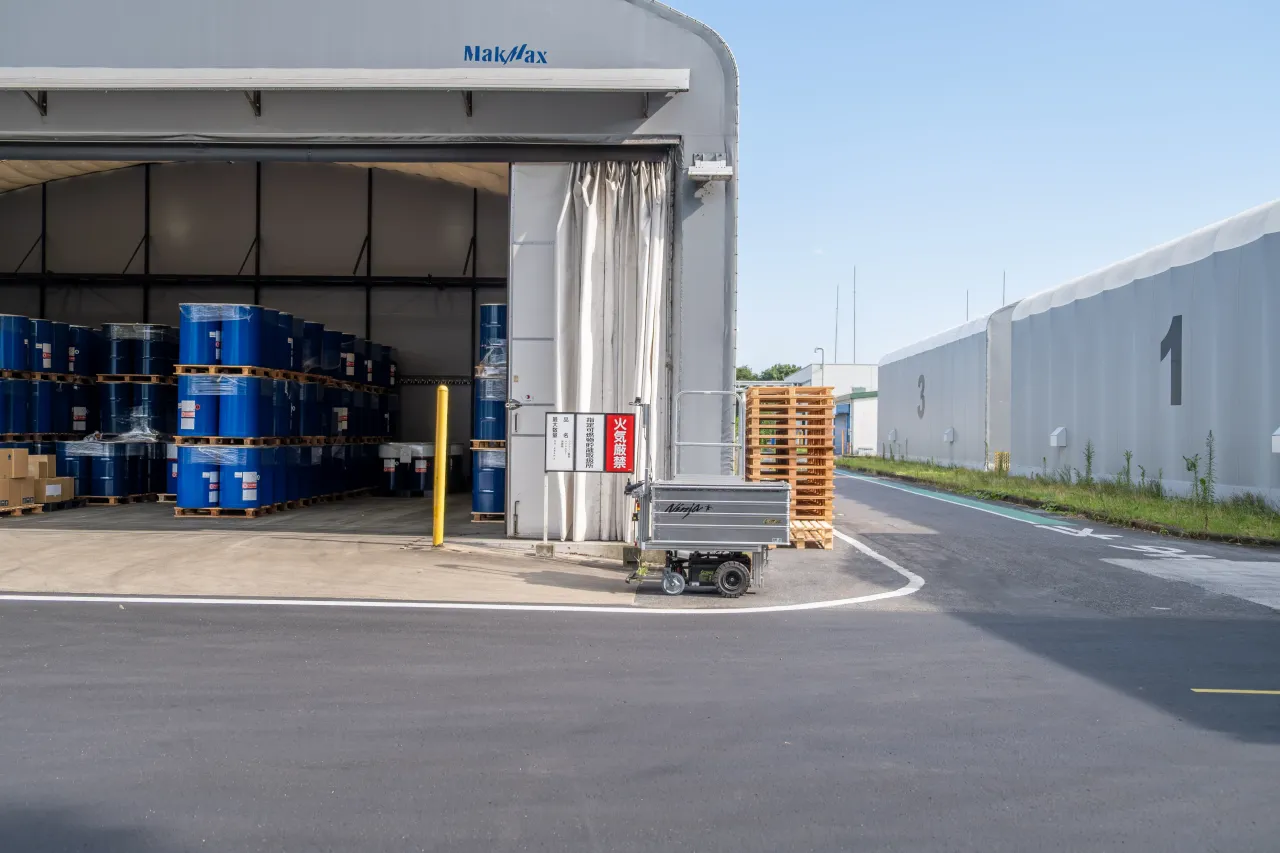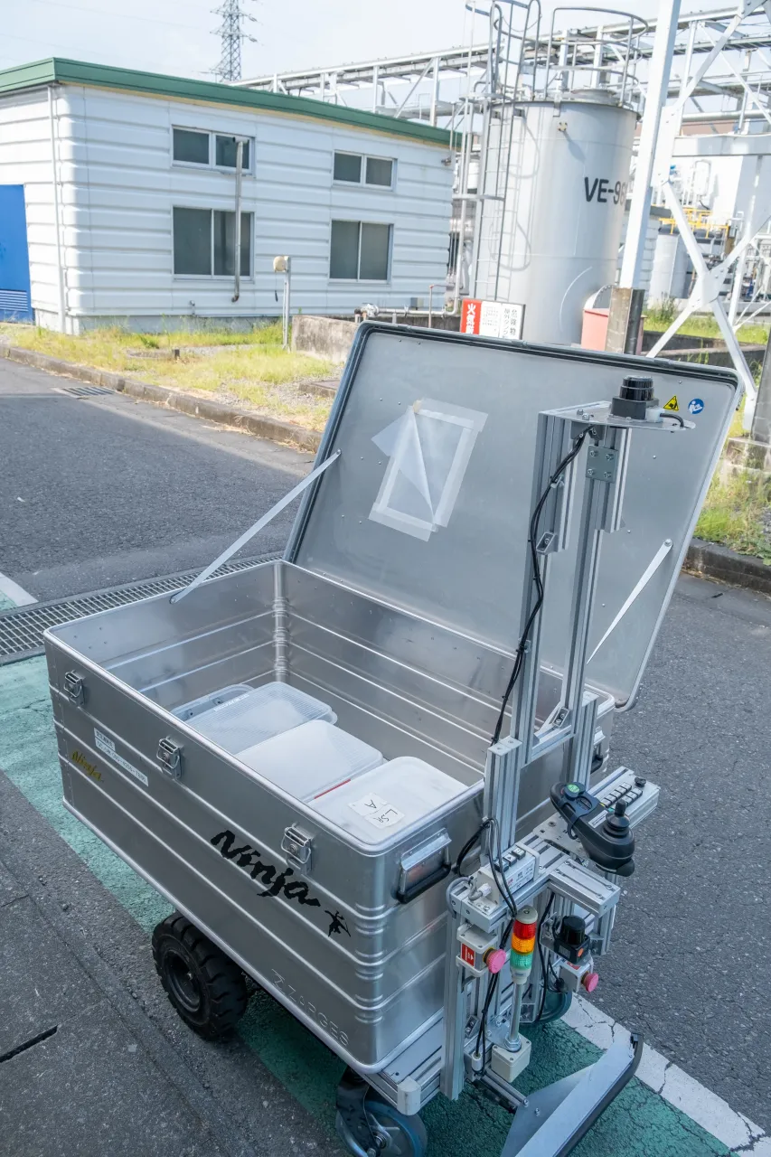 サウザーは、1日2回、品質部門と製造部門の間で行われる試験サンプルの受け渡しに使われている。現在のルートは約300mで、敷地内の屋外を走行。歩行者路を通りながら、外部事業者の出入りやフォークリフトの動線とも調和して運用されている。