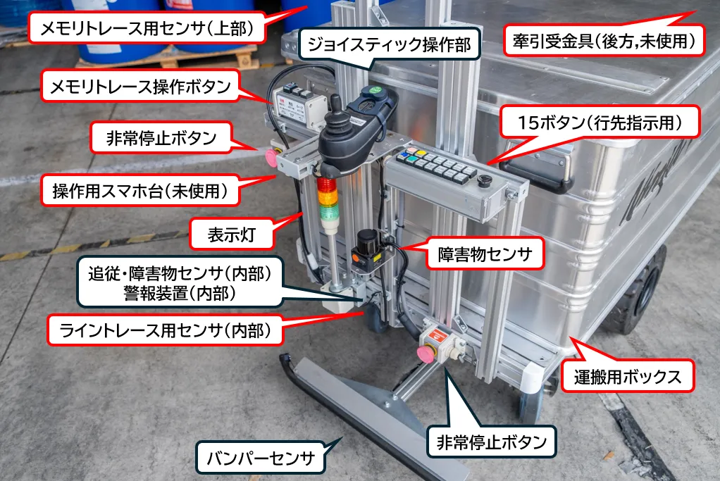 その言葉通り、導入時のカスタマイズ構成も細部まで社内で検討した通りに対応ができた。走行用センサの追加から、メモリトレース用操作ボタン、非常停止ボタン、荷台上の障害物検知用センサまで、必要に応じて柔軟に構成が組める。