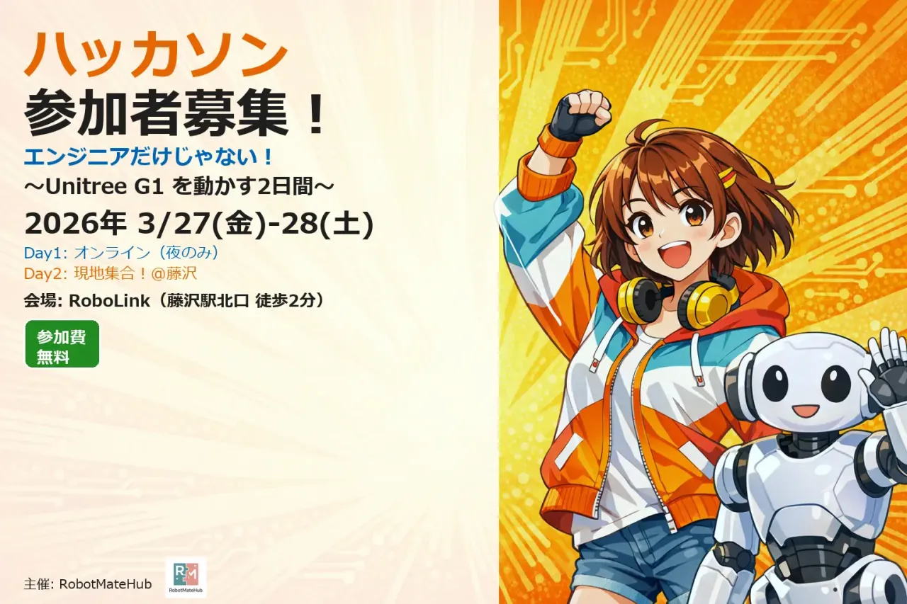 2026年3月27日・28日の2日間、神奈川県藤沢市の「ロボリンク」において、日本初(※)となるヒューマノイドロボット「Unitree G1」を使用したPhysical AIハッカソン「ロボットと生きる未来をデザインするハッカソン」が開催される。※主催者調べ