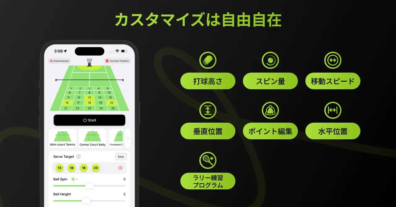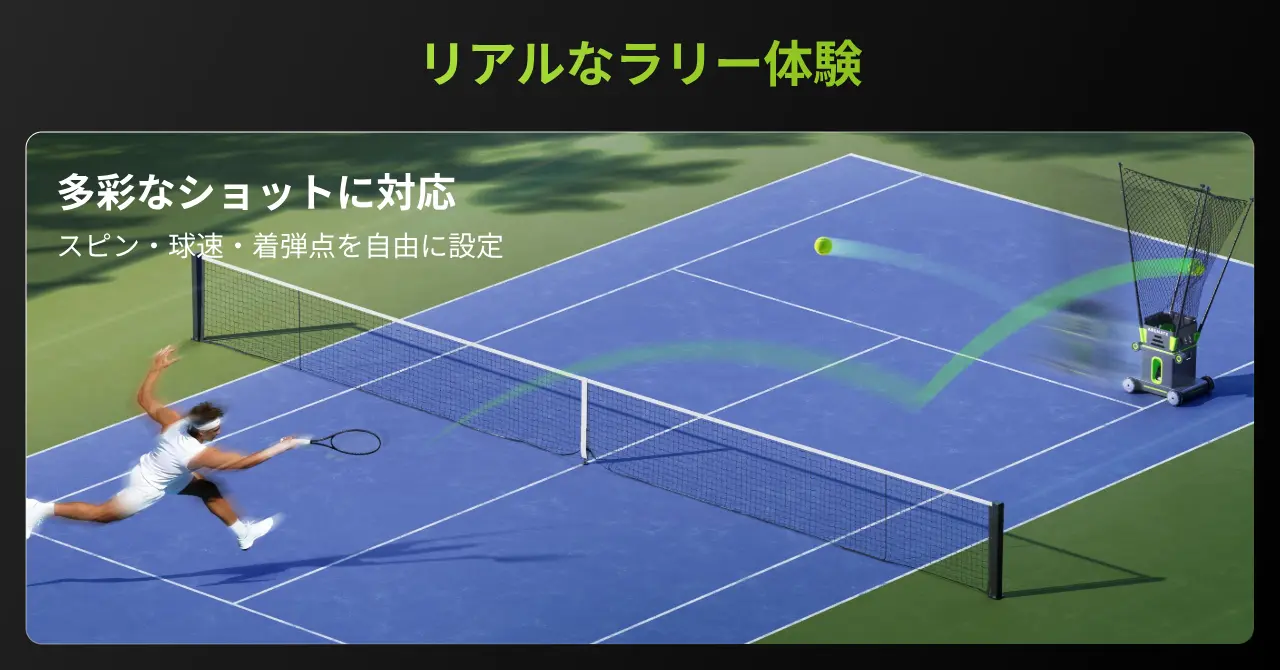 発球性能も極めて高い。最高時速約97kmのスピードに加え、トップスピン、バックスピン、スライスといった多彩な球種を打ち分けることができる。発球の水平角度は0〜180度、ロブの高さは約0.5〜8mと広範囲をカバーし、左右への振り回しやボレー特化など、実戦を想定した多様な練習メニューが用意されている。最大80球のボールを収容でき、スマートフォンやApple Watchからワンタップでトレーニングを開始できる手軽さも魅力だ。