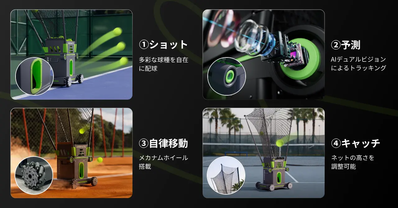 最大の特徴は、圧倒的な機動力と空間認識能力だ。本体には4KカメラとAIによるデュアルビジョンが搭載され、プレイヤーが放った打球の弾道を瞬時に読み取って予測する。そして、足回りに装備された全方向へ自在に移動できる特殊な車輪を駆使し、最高秒速約5mという俊敏なフットワークでコートを縦横無尽に移動するのだ。あらかじめ設定された場所にボールを出すのではなく、返球に対して自ら最適なポジションを取り「生きたボール」を打ち出す仕組みとなっている。