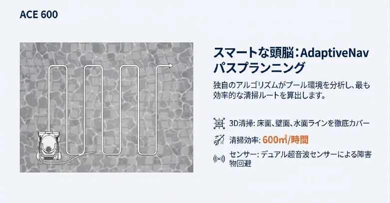 2026年2月より国内展開が開始された屋外向けコードレス・ロボティックプールクリーナー「ACE600」は、有線式と同等クラスの清掃性能を維持しながら完全なケーブルレスを実現した業務対応モデルだ。
