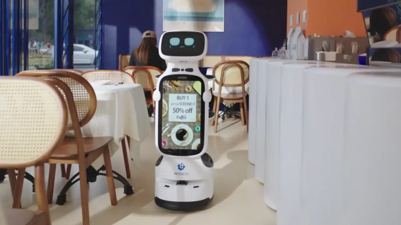 この製品が飲食業界にもたらす実用的な価値は、導入の物理的ハードルを引き下げたことだけではない。機体前面に搭載された18.5インチの大型ディスプレイによって、ロボットの役割が「作業の代替」から「売上の創出」へと拡張されている点に注目したい。